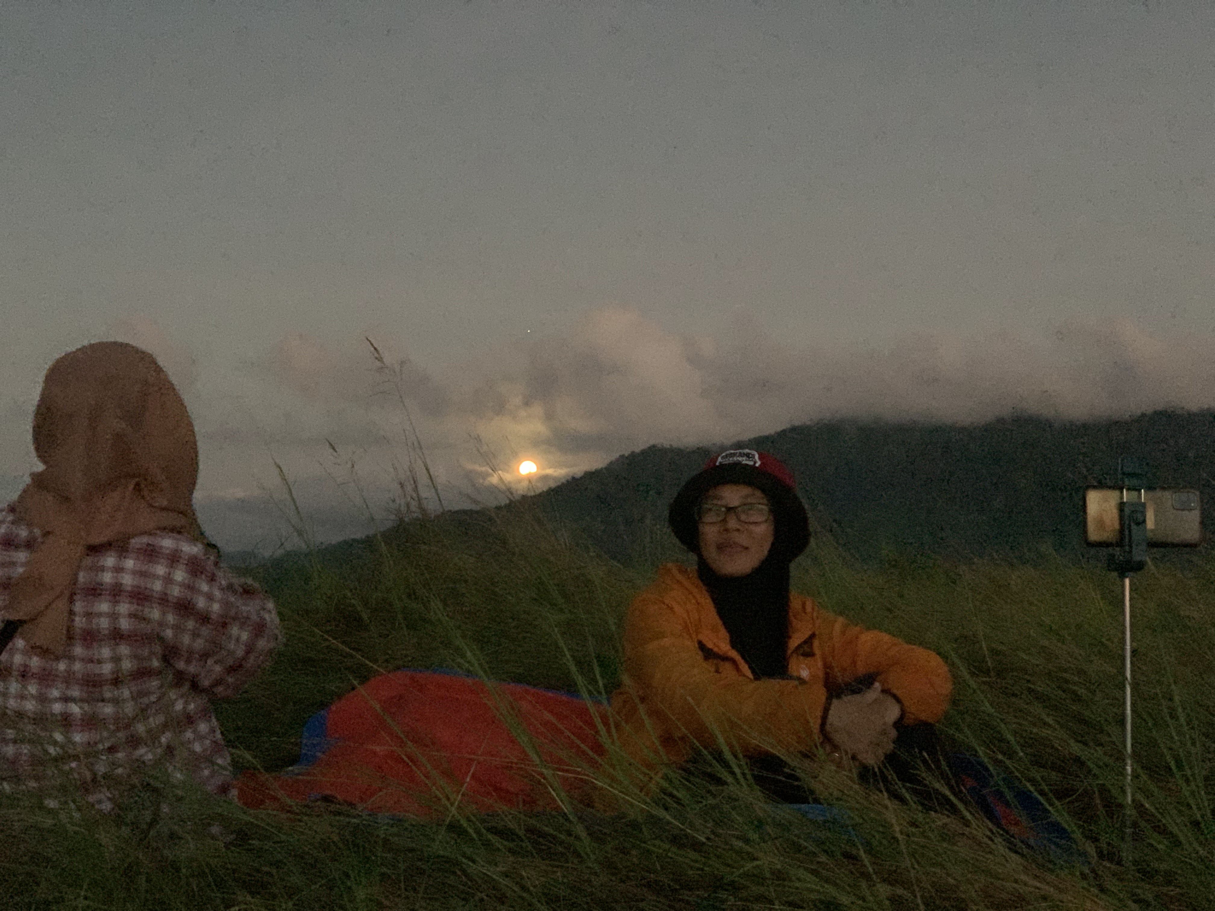 Pemandangan di sini memang memukau. Aku dapat menyaksikan kedua-dua makhluk Allah, iaitu bulan dan matahari serentak sedang bertukar shif. Subhanallah. Kalau ada kamera 360 memang syok dapat rakam saat-saat indah tu.