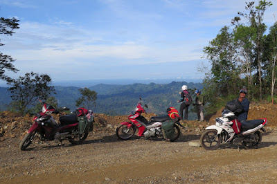 Kami ada berselisih dengan penduduk yang bekerja sebagai buruh binaan di laluan ini. Cuba perhatikan motorsikalnya.